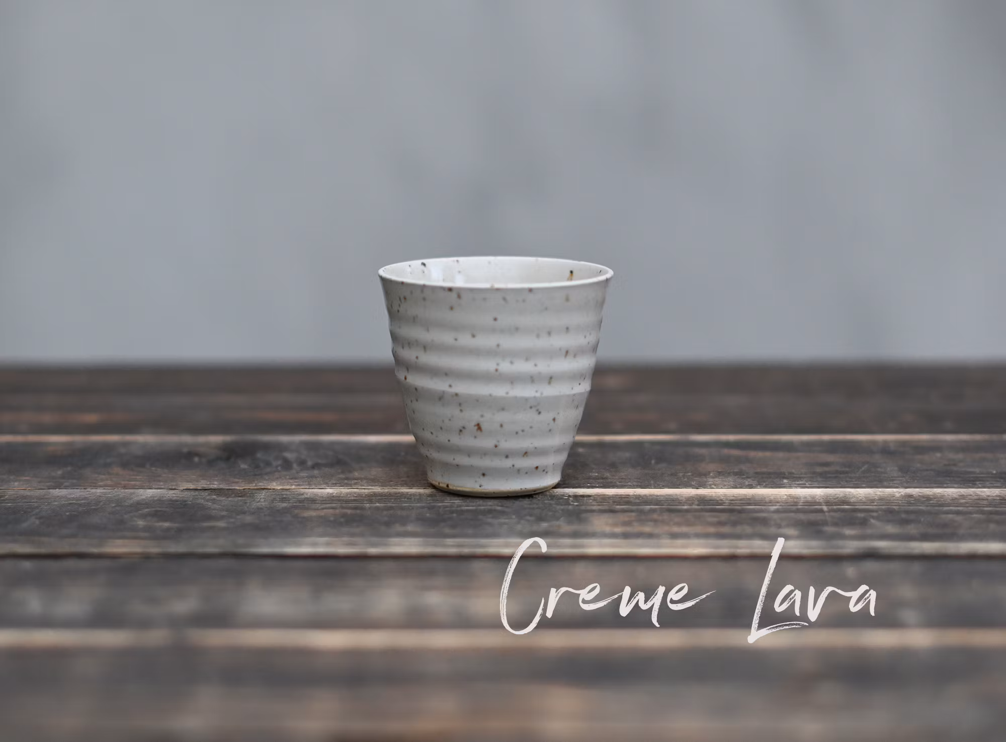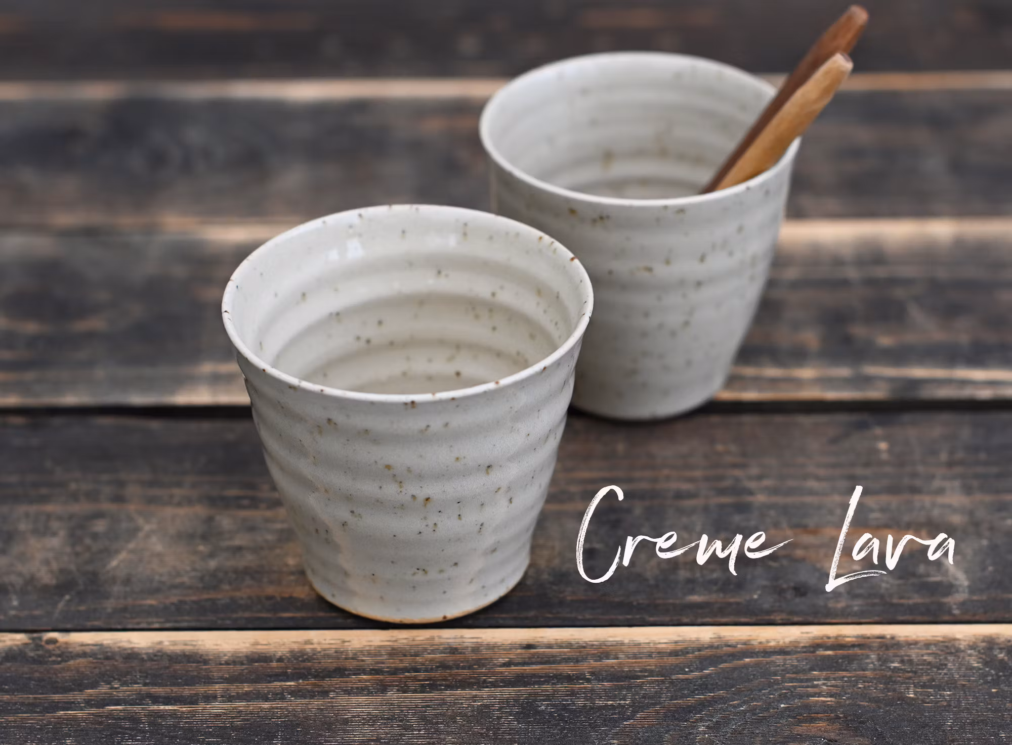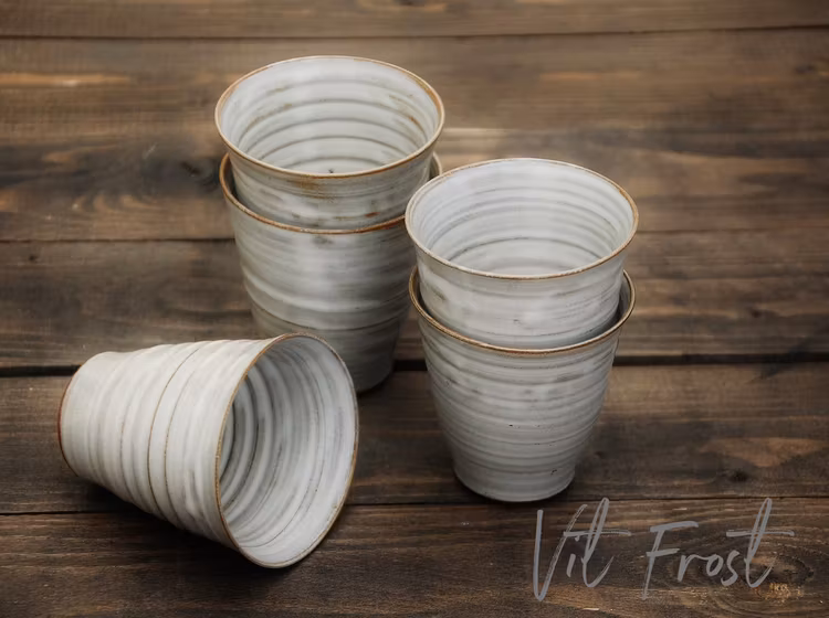 Muggarna är drejade i stengodslera och har tunna kanter.